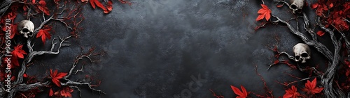 Spooky Haunted Forest Border Frame with Skulls and Red Leaves on Charcoal Black Background for Halloween Design with Copy Space