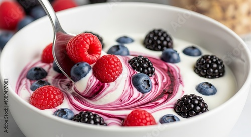 Spoon taking a scoop of swirl yogurt and fresh berries in a white bowl. Healthy breakfast and snack food concept