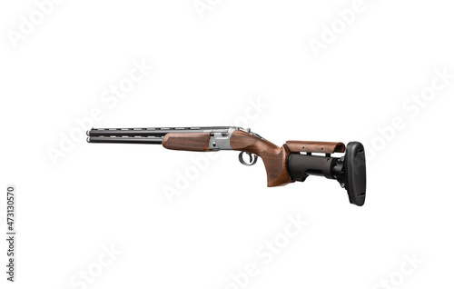 Sport double-barreled rifle with a vertical arrangement of barrels. Special sports butt on a shotgun. Isolate on a white back.