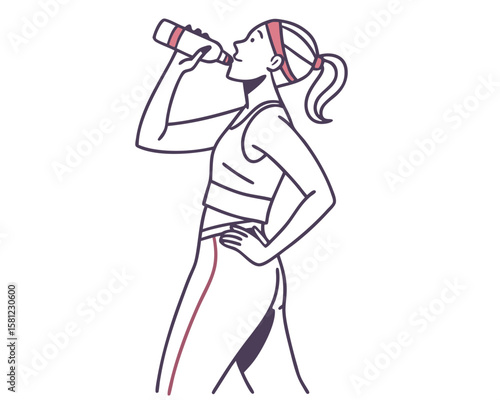 sporty, woman, drinking, water, physical exercise, white, background, female, fitness, health, athlete, hydratation, active, exercise, sport, gym, training, body, fit, lifestyle, energy, healthy, runner, girl, young, refresh, drink, realistic, art, illustration, icon, graphic, vector, clip art, isolated, concept, stylised, decor, pattern
