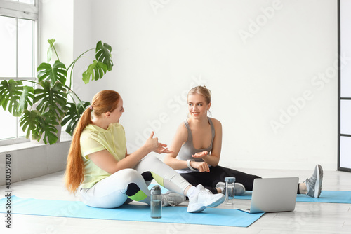 gym, laptop, sporty, woman, young, activity, adult, asana, athlete, body, care, caucasian, class, computer, exercise, female, fit, fitness, friends, girl, gymnastics, health, healthy, hobby, indoor, cyberspace, leisure, lifestyle, loss, mat, online, people, person, rest, shape, sitting, sport, activewear, stretching, talking, training, weight, woman, physical exercise, yoga