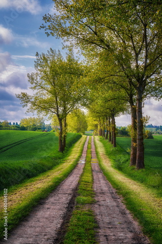 Spring field, rural drug wsrod half with sown goods, Poland