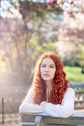 woman, spring, magnolia, portrait, beauty, young, ginger, nature, summer, park, happy, people, white, green, hair, tree, fashion, dress, smiling, smile, person, cute, garden, flower, outdoors