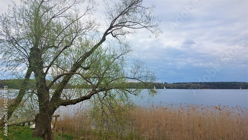 Spring landscape by the lake on a cloudy day - brown rushes, green grass, tree with branches and a pier