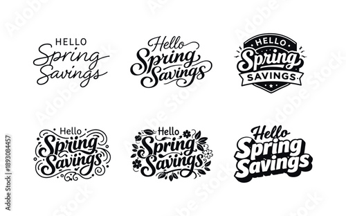 Spring Savings Lettering. Hello Spring Savings. Set lettering. harmonious lettering variations of the same emblematic concept, each with different artistic