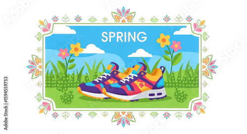 Spring Sneakers with Floral Illustration.. A detailed and professional representation of Spring, shoes, footwear.