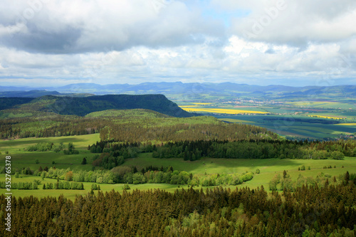 Spring Stolowe Mountain range- landscape near small, picturesque Pasterka village in Poland. Famous tourist attraction. Oldest mountains in Europe. View from Szczeliniec Wielki, Great Szczeliniec.