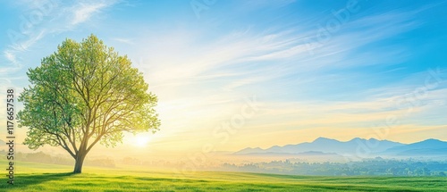 Springtime inspired relaxation. Serene landscape with a lone tree under a bright sky at sunrise.