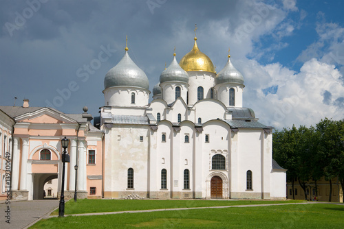 St. Sophia Cathedral in the background of a stormy sky July afternoon. The Kremlin of Veliky Novgorod, Russia