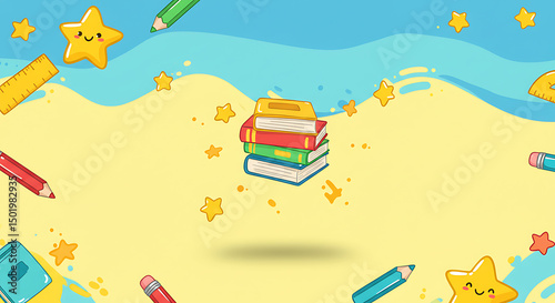 book, stack, draw, cartoon, cute, happy, bright, fun, sea, beach, education, school, study, learning, background