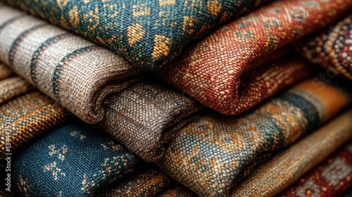 fabric, textile, texture, pattern, woven, rug, carpet, tapestry, clothes, material, design, hand-made, craft, home, decor, interior, style, vintage, antique, ethnic, traditional, geometric, abstract, colours, brown, beige, orange, red, teal, green, blue, natural, soft, warm, cosy, comfort, autumn, winter, elegant, luxury, rich, detailed, fold, pile, stack, closeup, background, surface, art