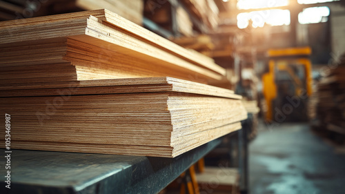 Stack of plywood sheets in a warehouse