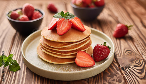 Stack of tasty pancakes with fresh strawberries on ceramic plate. Delicious food for breakfast.