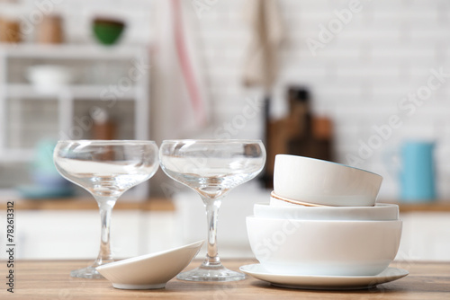 Stack of white clean tableware and glasses on wooden table in kitchen