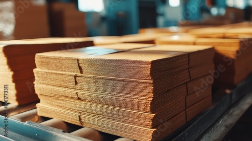 Stacked cardboard sheets ready for packaging in a warehouse environment with sunlight filtering through the windows