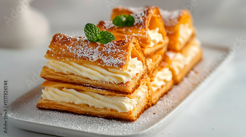 pastry, dessert, cream, sweet, food, baked goods, layered, triangle, crispy, puff pastry, vanilla, whipped cream, delicious, confectionery, plate, white background, light, gold, golden brown, sprinkled, powdered sugar, closeup, stacked, bakery, pastry, food photography, homemade, yellow, light brown