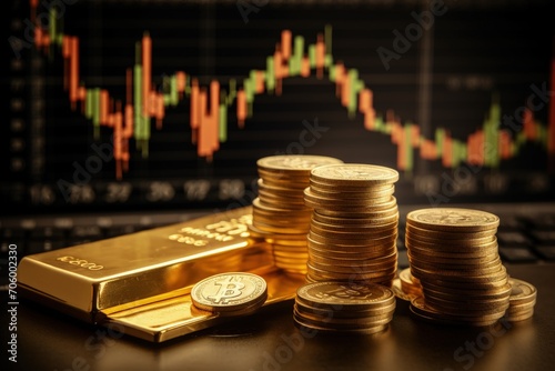 Stacked gold bars, golden coins, stock exchange ambiance, and dynamic stock charts a visual narrative of wealth, finance, and market trends