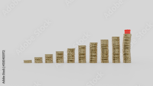 Stacks of Coins Increasing in Height, to a Stack With a Small Red House On Top