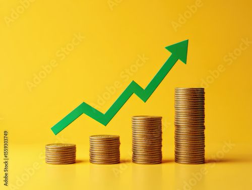 Stacks of Coins with Upward Trending Green Arrow on Yellow Background, Representing Financial Growth, Investment Success, and Economic Prosperity