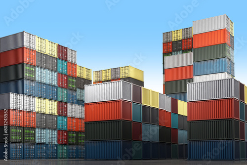 Stacks of colorful shipping containers against a clear blue sky. 3d image