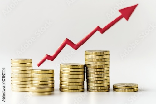 Stacks of gold coins and red arrow. Graphical representation of financial growth. Concept positive financial progress or investment returns.