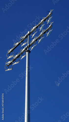 floodlight, blue skies, technology, outdoor lighting, electricity, industrial design, sky background, minimalism, sporting event, energy, illumination, sky, blue, light, metal, power, antennae, street, pole, steel, electric, lighting, construction, stadium, solar, architecture
