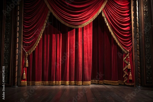 Stage with Ornate Red Velvet Curtains and Golden Tassels on a Dark Wooden Floor