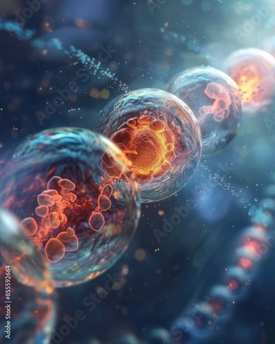 Stages of cell division visualized concept selective focus on each phase, dynamic, Fusion biology textbook backdrop