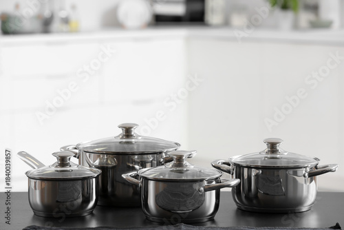 Stainless cooking pots on black table in kitchen, closeup