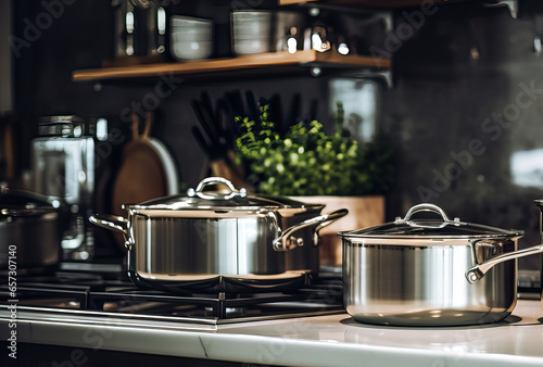 stainless steel, pot, modern, kitchen, interior, cookware, setup, appliance, contemporary, decor, kitchen utensile, home cooking, interior design, arrangement, equipment