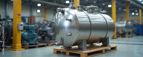 Stainless steel pressure water tank in factory. Industrial equipment storage tank, mechanical infrastructure, engineering, water treatment, heavy duty. Water supply, plumbing, reservoir,