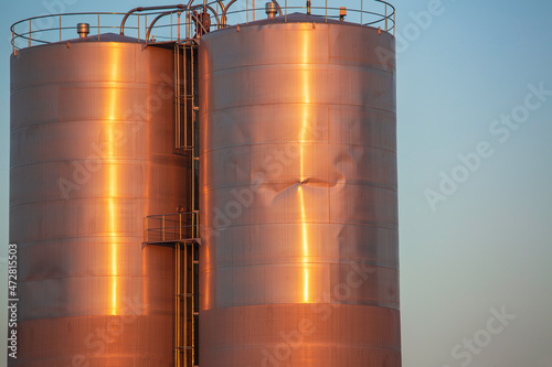 Stainless steel silos in the chemical industry, bulk plastics silo against