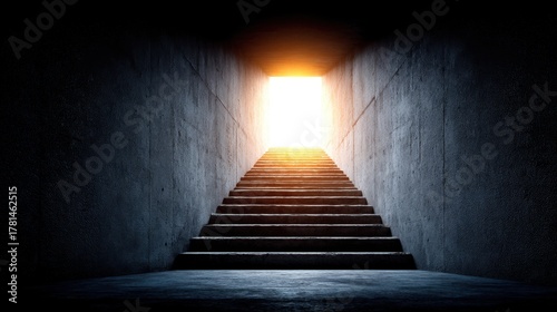 staircase, light, tunnel, hope, opportunity, step, concrete, darkness, entrance, abstract, architecture, perspective, isolation, journey, aethereal, illumination, escape, background, texture, emotion, surreal, symbolic, transition, direction, pathway, ascent, freedom, mystery, unknown, landscape, concept, visual, scene, travel, design, use, interior, environment, silhouette, gradient, high-coloured, contrast, open door, spiritual, nirvana