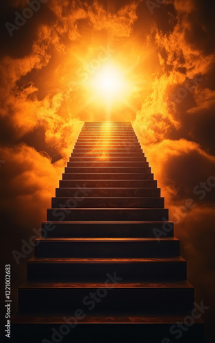 Stairway to Enlightenment: A dramatic composition of a long staircase ascending towards a radiant, sunlit sky, creating a symbolic representation of journey, ambition, and spiritual awakening.
