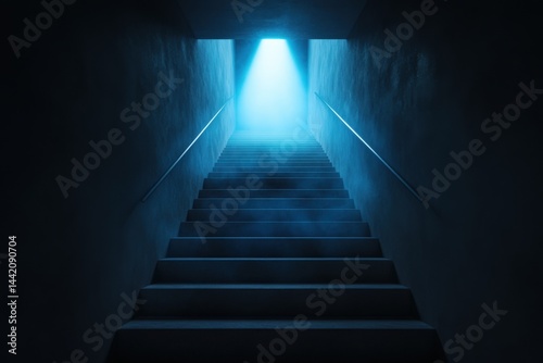 staircase, stair, light, heaven, up, exit, way, ladder, escape, climb, path, future, success, bright, hope, tunnel, darkness, entrance, doorway, interior, architecture, building, hopeful, mystery, abstract, underground, concrete, glow, design, blue, step