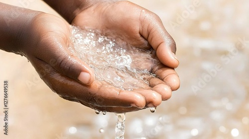 Standing by a flowing stream on a sunny day, hands catch the crystal-clear water in a beautiful natural setting