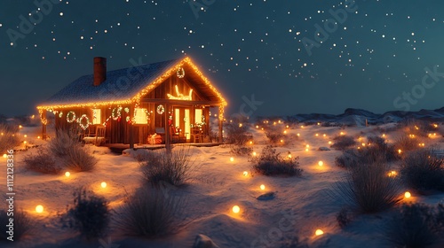 Standing lonesome in a sea of soft sand is a charming desert cabin decked out with festive lights and decorations.