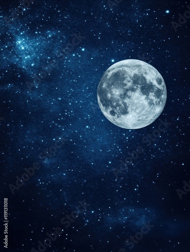 Starry night sky over a full moon illuminating constellations in a serene landscape. Generative AI