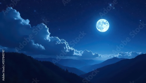Starry sky, moonlit cloudscape, dark silhouettes of mountains, high, night, above