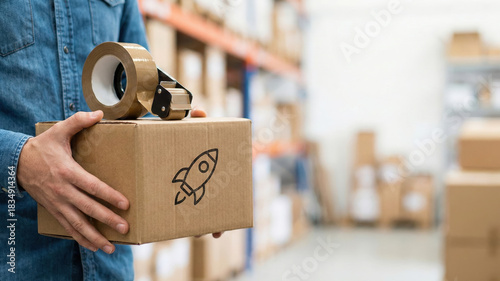 Start up business concept with person holding cardboard box and tape dispenser in warehouse environment for shipping