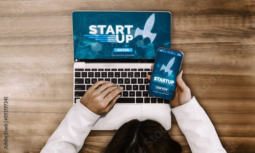 Start Up Business of Creative People Concept - Modern graphic interface showing symbol of entrepreneurship, fund, and project plan to start a new small business by smart group of entrepreneur. uds