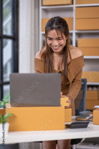 Startup girl Small SME business owners work with laptop computers at work. with parcel paper boxes for delivery to customers online selling, Ecommerce,