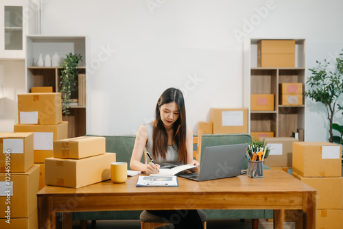 Startup small business SME, Entrepreneur owner woman using smartphone or tablet taking receive