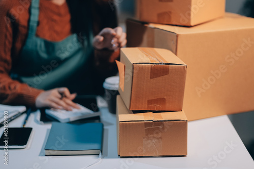 Startup SME small business entrepreneur of freelance Asian woman wearing apron using laptop and box to receive and review orders online to prepare to pack sell to customers, online sme business ideas.