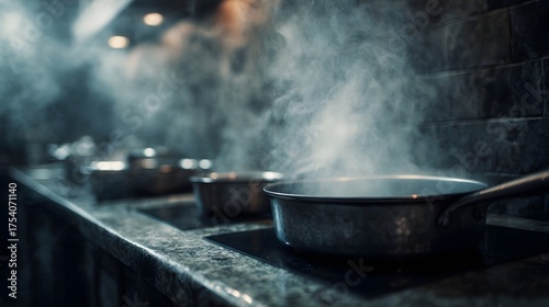 steam, pot, pan, stove, kitchen, cooking, smoke, heat, counter, tabletop, kitchen utensile, cookware, metal, shiny, dark, moody, atmosphere, eatery, professional, preparing, food, boiling, hot, culinary, domestic, appliance, burner, action, process, activity, setup, equipment, fume, vapour, energy, sharpened, detailed, textured, surface, art, interior, commercial, intense, tied-up, utility, station, scene