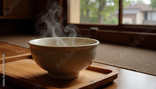 Steaming bowl of comfort resting on a wooden tray in a serene indoor setting with soft sunlight streaming through the window