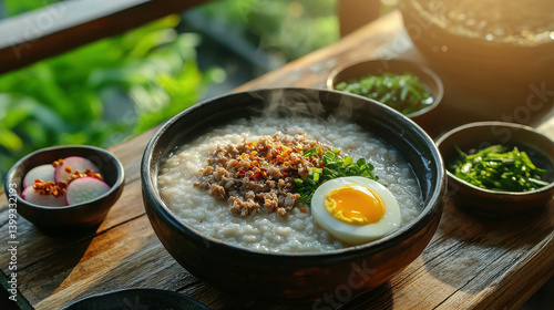 rice, porridge, breakfast, bowl, steaming, food, cooking, meal, ingredient, egg, herb, garnish, green onion, hot, healthy, dish, cookery, comfort, traditional, rustic, warm, wooden, table, asian, savoury, spice, vegetable, chili, fresh, creamy, nourishment, enjoyment, simplicity, aroma, tasty, homemade, culinary, favor, inviting, colours, plating, nature, scene, sunlight, lifestyle, ambience, morning, freshness