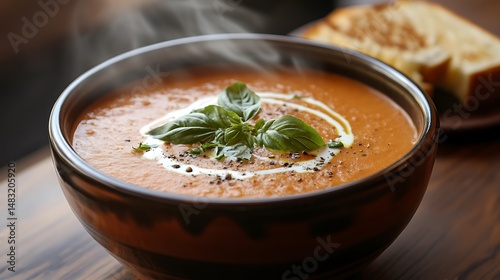 Steaming Bowl of Tomato Soup with Basil Garnish