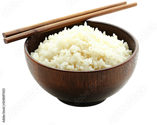 Steaming bowl of white rice with wooden chopsticks, perfect for Asian cuisine. This dish is staple in many cultures, symbolizing comfort and nourishment