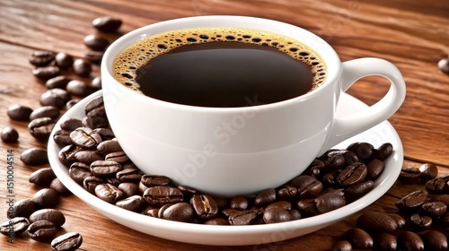 Steaming Cup of Freshly Brewed Coffee Surrounded by Roasted Beans on Rustic Wooden Background
